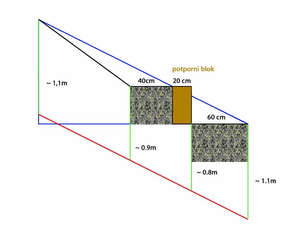 bi se posadilo cveće (ruže i još ponešto, max dubina korenja do 40cm). Donja serpetina bi bila širine 60cm, a gornja 40cm. Tačna konfiguracija terena pre i posle data je na slici.