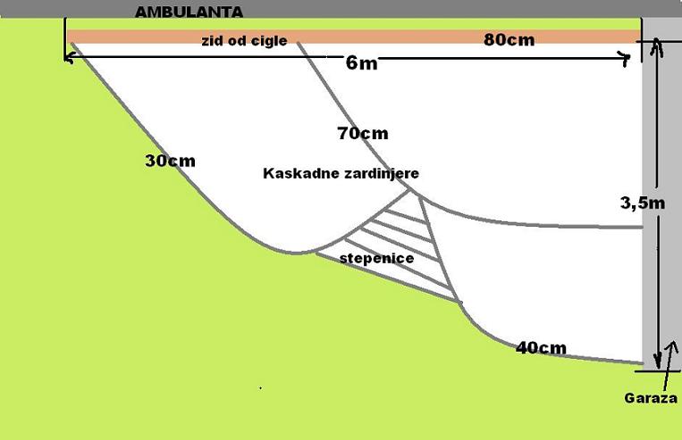 Kaskade nameravam da ozidam u jednom uglu dvorista izmedju zida moje garaze i zida ambulantne zgrade,koja granici moj vrt!