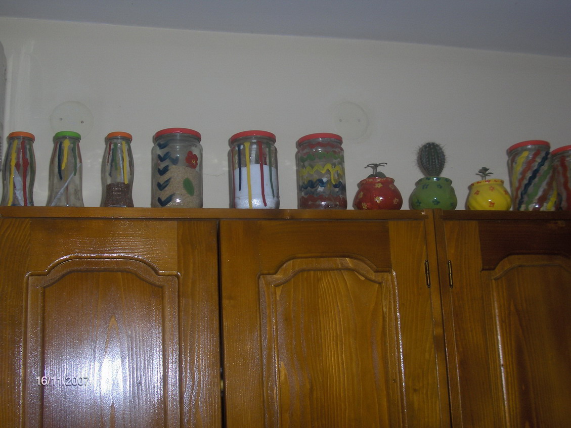 Slikacu ih cim mi sestra vrati aparat,Nedo mi smo oslikavali zacine a cerka se setila pa je lepila neke zacine na flasice da znas sta je i da obavezno ih izlakirate da mozete da ih prebrisete...ipak je to kuhinja