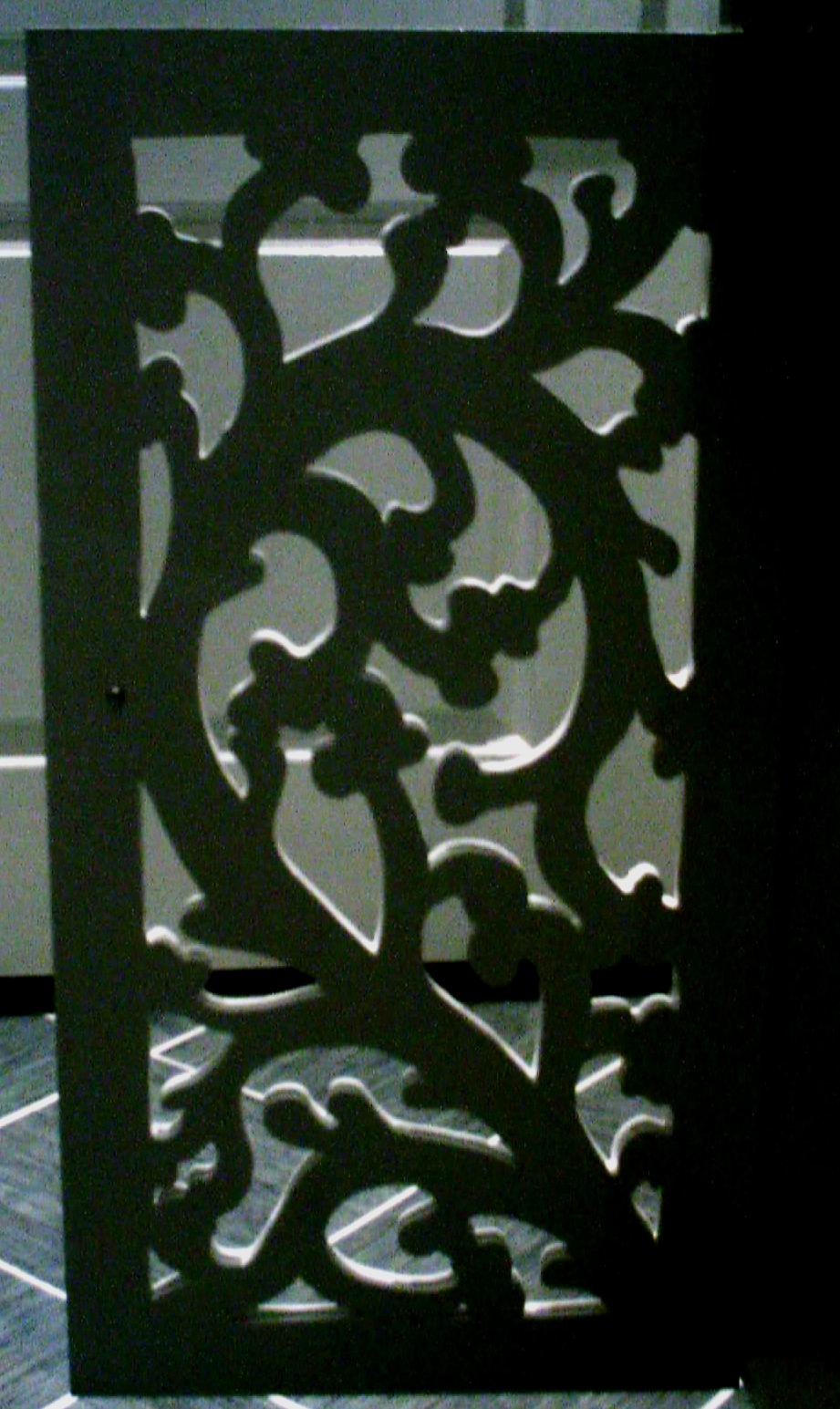 Medijapan je idealan za ovakve rezbarije. Najpre se na sirovoj ploci nacrta "biljka" koja se rezbari. Prvo samo osnovne zile pa onda ogranci, pa pupoljci, puno crtanja i brisanja dok se ne dobije zeljena forma. Moze najpre na papiru pa se na kraju indigom prenese na plocu. Konture se rezbare obicnom ubodnom testerom sa listom koji je uzan kako bi se savladale krivine malih precnika. Probusi se rupa u sredini konture, pa se iz te rupe po liniji reze okolo dok komad ne ispadne. Tako se sve konture izvade i na kraju ostane biljka. Druga vrata isto tako samo simetricno preneta sa crteza. Za jedna vrata sam potrosio oko 90 minuta ( i dva lista testere-brzo se tupe u medijapanu, mada su bile kvalitetne-metabo)