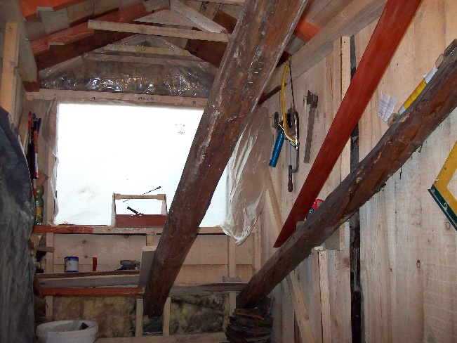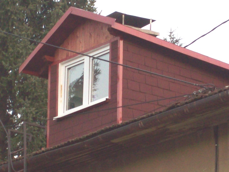 Trenutno sam je uslikao pa možda nije neki kvalitet slike,preko nosivih greda sa boka je išla daska,okapni limovi,preko nje ter papir pa tegola,uglovi su zaštićeni ,,L" limovima,pokrov takođe daska ter papir pa tegola,stara je ovo zgrada,očekujemo donaciju za popravku krova tako da nisam pretjerano ulagao,prostor koji je uzela badža dao mi je površinski količinu crijepa koji se ne može više naći na tržištu pa sam sa njim presložio ostali dio krova koji je bio kritičan,na slici se fino vidi koliko je badža iskočila iz stvarno strmog krova.Krajevi krova badže idu ispod samara koji su već bili,jedini način da se kvalitetno spoji crijep sa tegolom a da ne izgubim na visini.Iznutra je staklena vuna,parna brana pa regips.