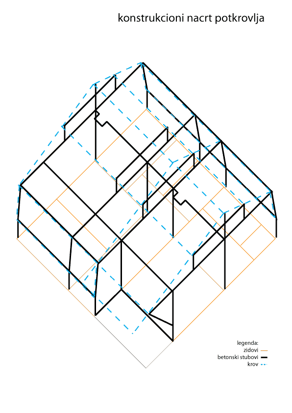 ovako je zamisljeno, posto se ceo krov skida tako da od postojecih se nece zadrzati nista. isao sam na varijantu da se stubovi poklapaju sa prizemnim delom i spratom tako da se nastavljaju.