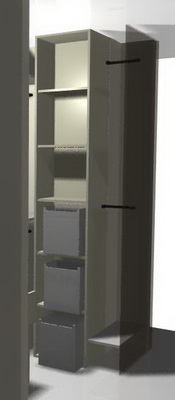 elem, garderoba je duboka 1 metar. dubina plakara je obicno 60-ak cm, ja sam stavila svega 50 cm dubine, znaci, ostaje prostora 40-50 cm. tu ne moze nista cestito da stane sa strana, pa bih ja to prepustila vremenu i potrebama. stavila sam da deo s policama bude 45 cm sirine, dubina moze da bude ili puna, kao ostatak, ili plice (mada bi zbog fioka bolje bilo da je puna dubina). na ovoj slici sa djumom sam pogresno postavila elemente, treba levo da ide uski, pa desno siroki, zbog cevi (smetale bi fiokama).