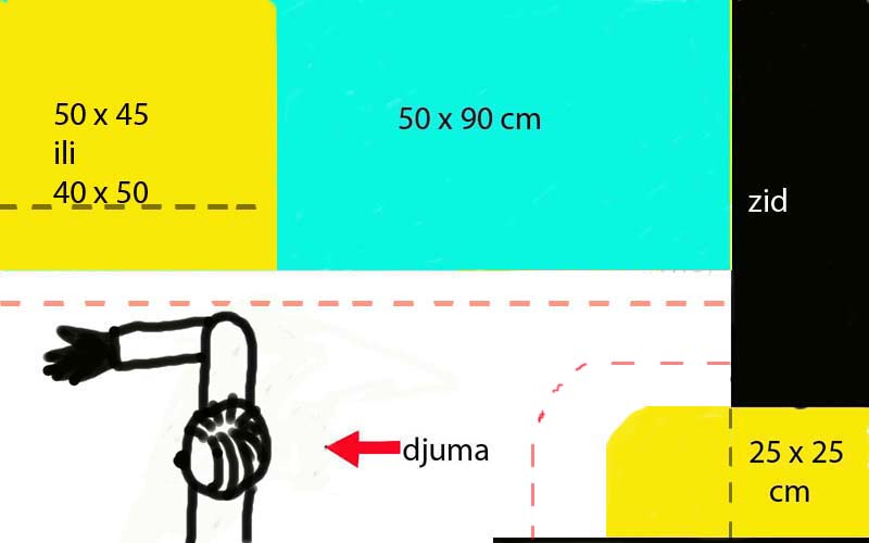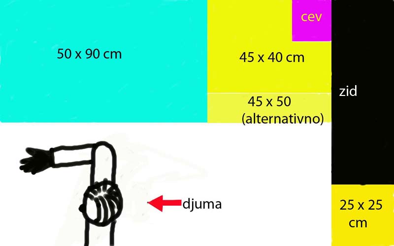 Djuma, ti svo vreme crtaš kao da ti je prostor 3x3m. Probaj da nacrtaš pogled od gore sa realnim dimezijama. Neće da može tako.