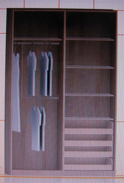 i sad, u uski deo bi dole isle fioke, iznad toga police, a u siroki bi gore isla jedna polica (za posteljinu, recimo), a ispod dve stangle za vesanje stvari. na sajtu ikee moze da se igra tim elementima, cisto da se stekne konkretnija slika, iako ne moze da se radi po merama: