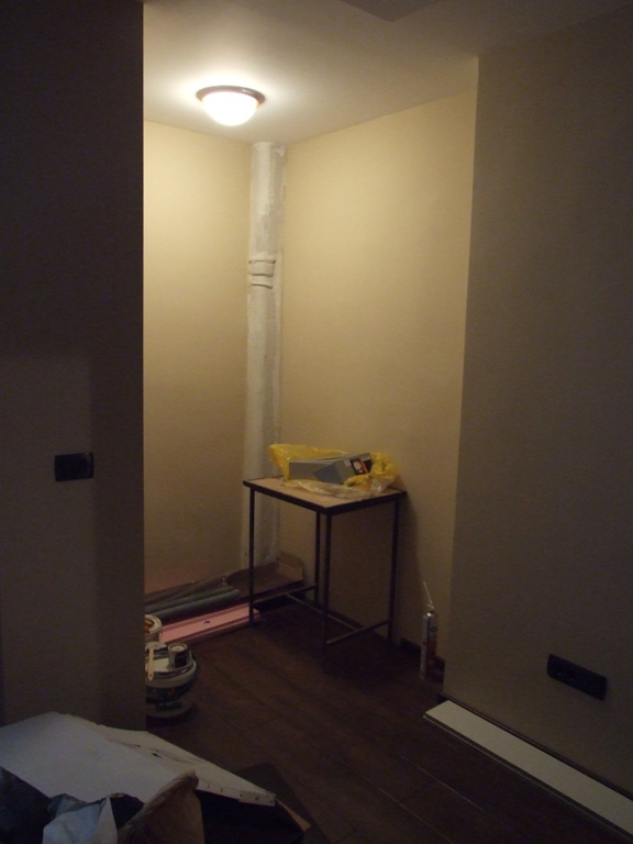 Prvo, onaj uži srednji deo- tu bi mogao da postaviš samo police koje bi imale leđa od lesonita da ti stvari ne dotiču cev. Prostor u tom delu je suviše uzan da bi dobio funkcionalne fijoke.