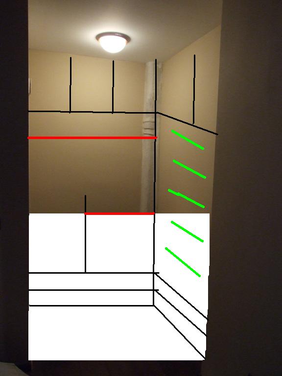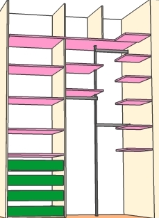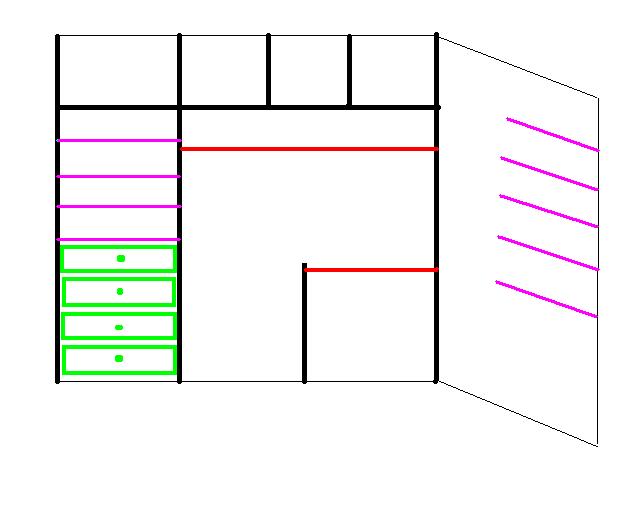 postavljam sliku onog do cega sam ja dosla, s tim sto treba jedan deo da bude siri, drugi uzi (ovo je za plakar 1,5 m sirok, visok 238 cm, dubok 58 cm). primeti kako izgleda shipka za vesanje, ostavljen je i jedan deo za dugacke stvari (ide u L, prati zelene tackice).