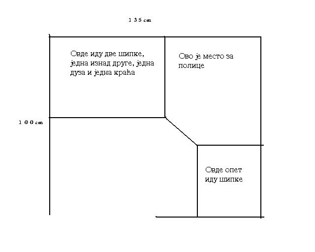 U desnom ćošku plakara ima i cev, koja je 12*17cm pa treba i to imati u vidu. Mislio sam da imam i pravo i desno, kad udjem u garderober, one horizontalne šipke za kačenje odela, pantalona...a da iznda toga celom dužinom, kao i na mestu gde je cev, ubacim police(jbga kad ne znam da nacrtam inače bi sve bilo lakše).