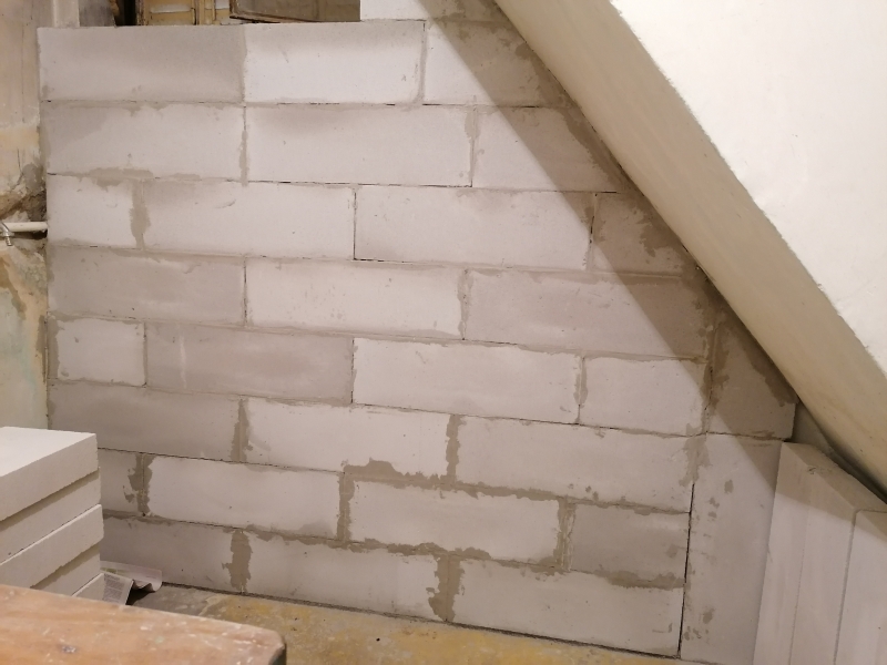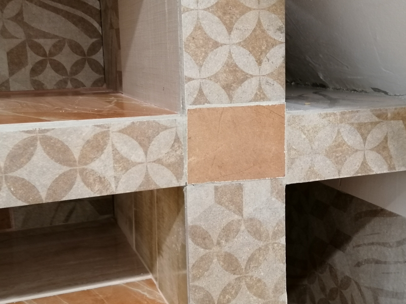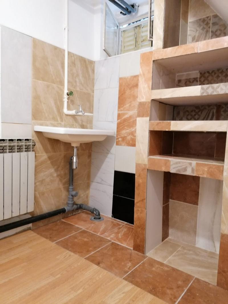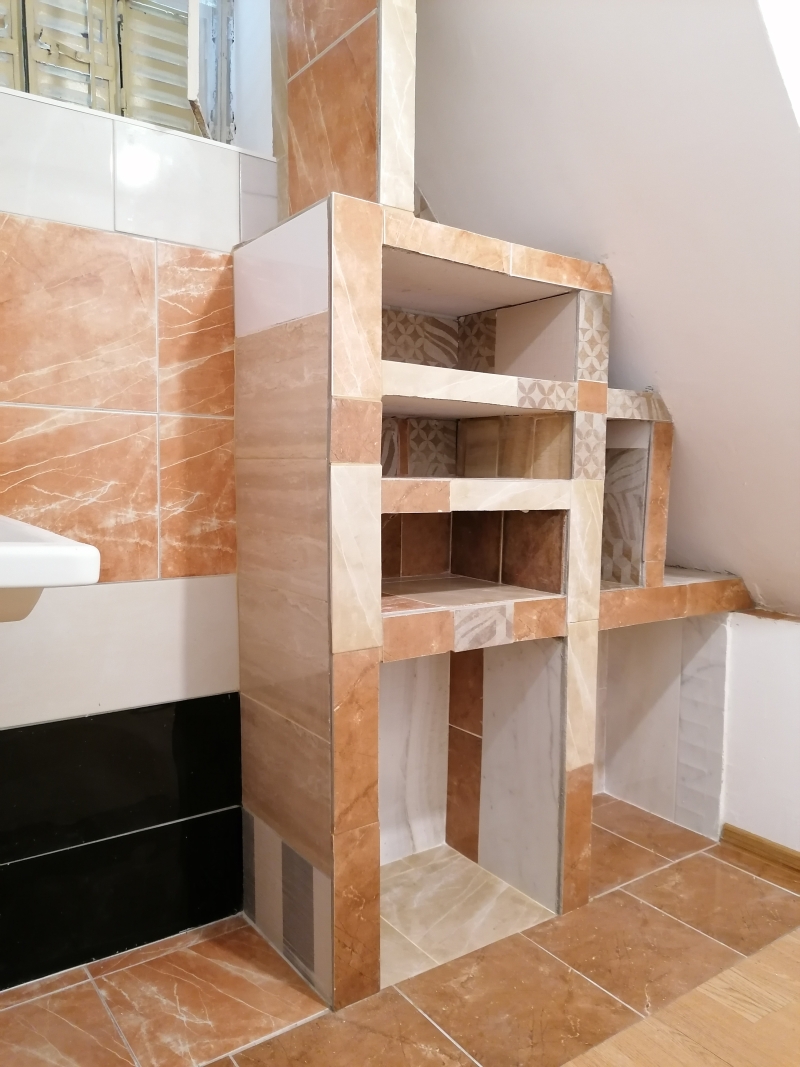 Prostor ispod stepeništa popunio sam plakarom od keramike. Prvo sam poravnao zid ytong blokovima. Takođe sam blokove koristio za konstrukciju "plakara" kako već da ga nazovem. Radio sam kao za sebe, unikatno, šareno, ne obazirući se da li će se drugima svideti. Ženama se jako sviđa, odlepe, a muškarci uglavnom komentarišu da sam se "igrao", puno vremena uložio. Na pod sam položio dva reda pločica, a ostalo je laminat koji se knap uklapa po debljini. Materijal me je izašao oko 150e. Dole desno držim usisivač, a u ostalom delu držim svoj alat. To je podrumski deo, nije prolazna soba.