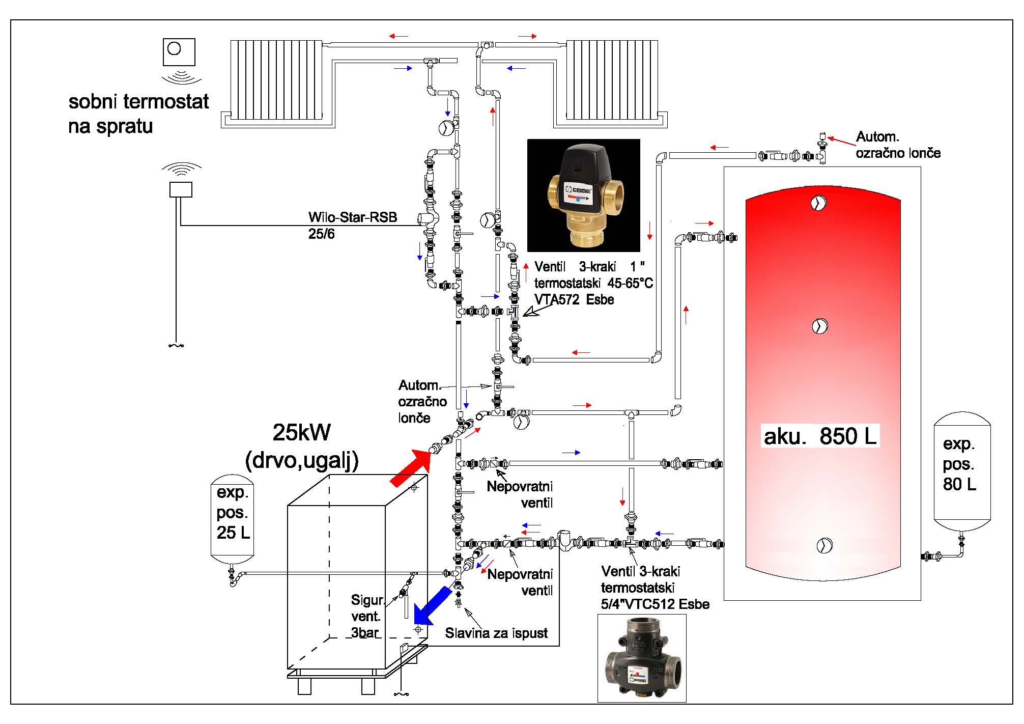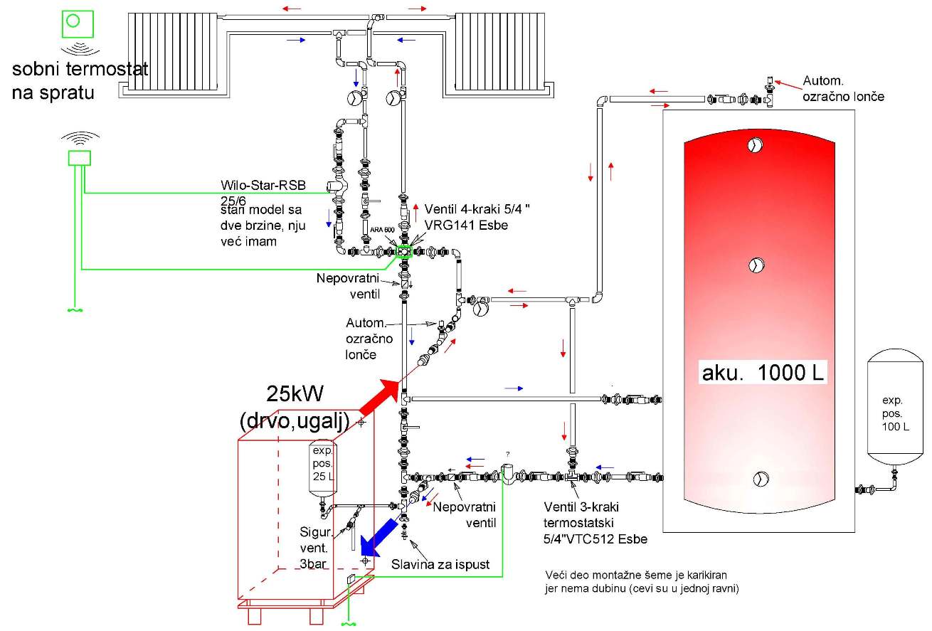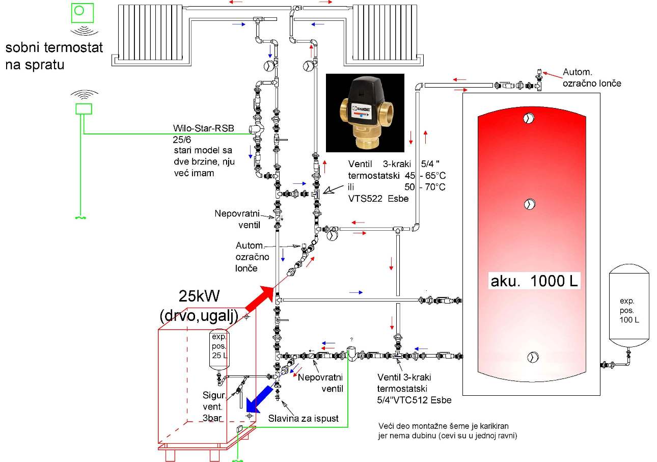 Na osnovu iskustava koja su izneta u temama vezanim za akumulator toplote prepravio bih postojeću instalaciju kotla na čvrsto gorivo snage 25kW. Postojeće stanje je najjednostavnije moguće pumpa na povratnom vodu plus po jedan ventil i termonanometar na odlazu i povratu i to je sve. Grejem prizemlje i sprat 160m2 ukupno. Ugradio bih akumulator toplote i nastavio sa standardnim grejanjem. Nemam aspiracije za kombinacije sa kotlom na struju niti naknadno dodavanja nekoliko bafera i prelazak na konforan način grejanja. Želja mi je samo da poboljšam regulaciju jer ovako gotovo da je i nemam (često se pregrevaju prostorije a temperatura neretko ide i preko 27-28C).Čisto bacanje para. Ovako bi na većem broju radijatora postavio ventile sa termoglavama i delom rešio problem a delom automatikom.