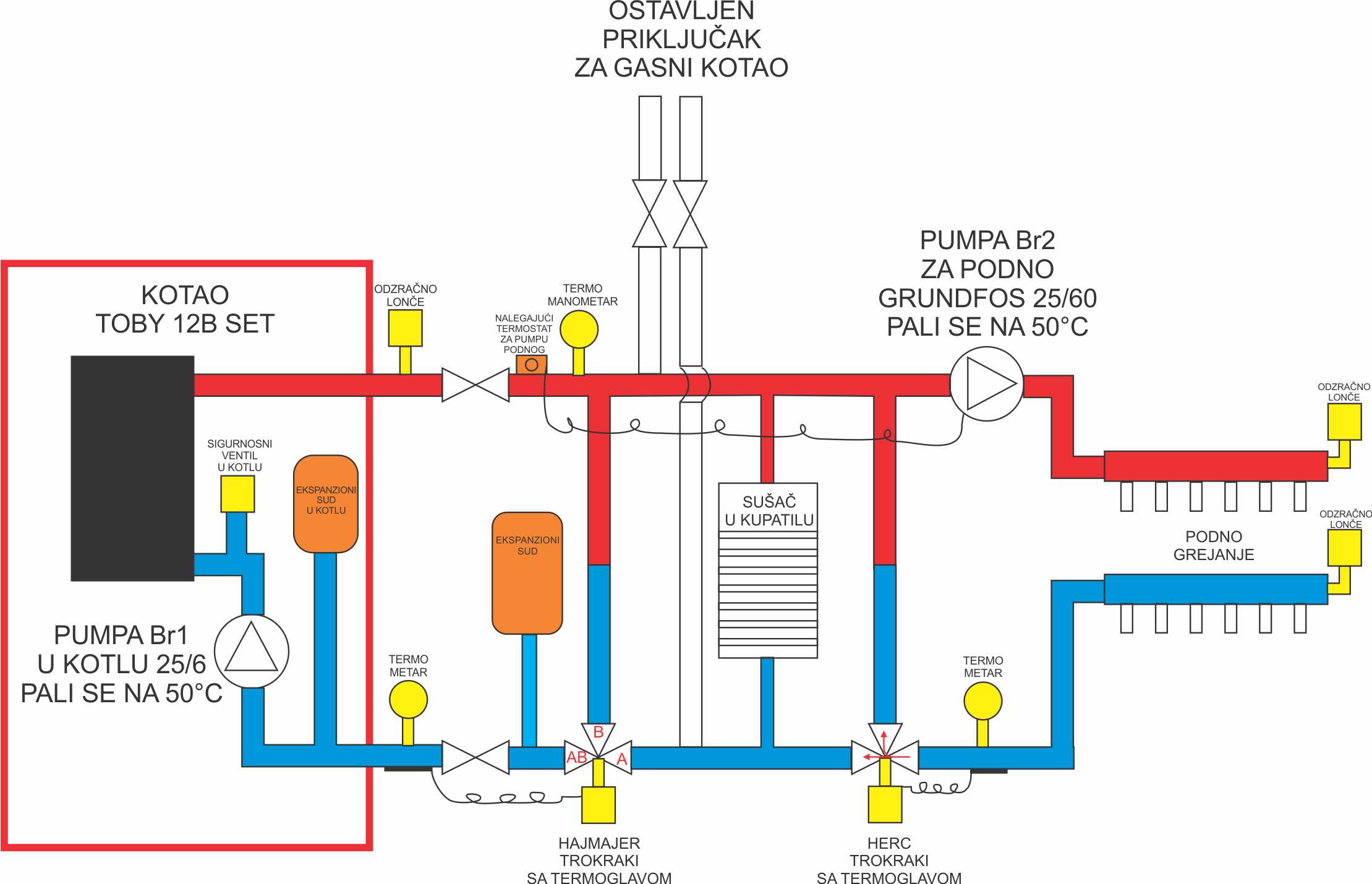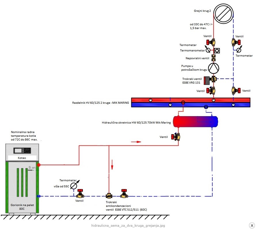 U prilogu je i jedna šema pravilno izvedene hidraulične instalacije za dva grejna kruga, kao i ispravno setovane sve radne temperature i pritisak u sistemu.