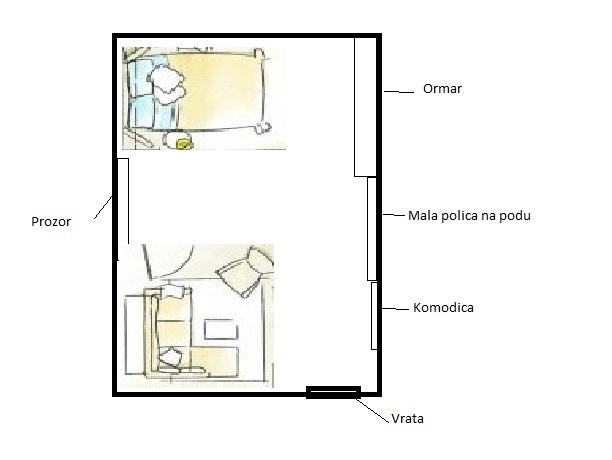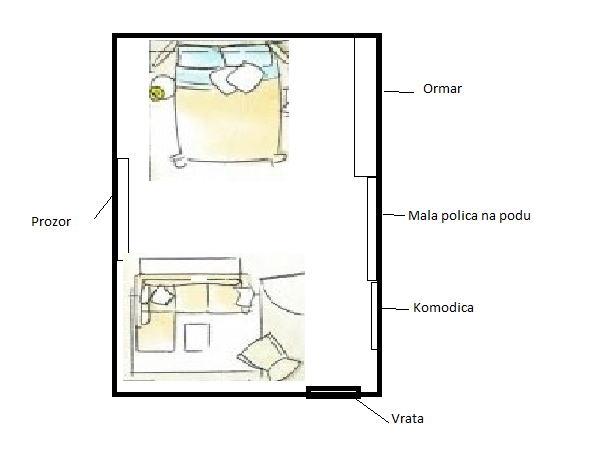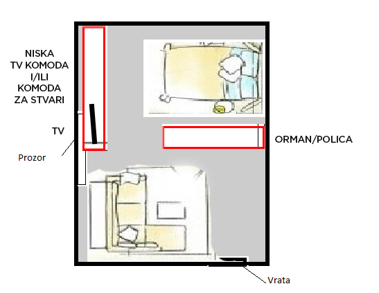 Evo i mog amaterskog crteža sobe, a dobrodošle su i druge ideje za uredjenje ovog prostora cudne namene