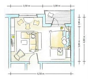 - Postojeći nameštaj ću uglavnom izbaciti, tako da tek planiram da kupim ili neku ugaonu garnituru manju ili neku kombinaciju troseda i fotelje sa malim stolom, za prvi deo sobe i francuski krevet za drugi. Ostavicu samo 1 ormar i police neke manje koje su novije i koje su sada na zidu suprotnom od prozora.