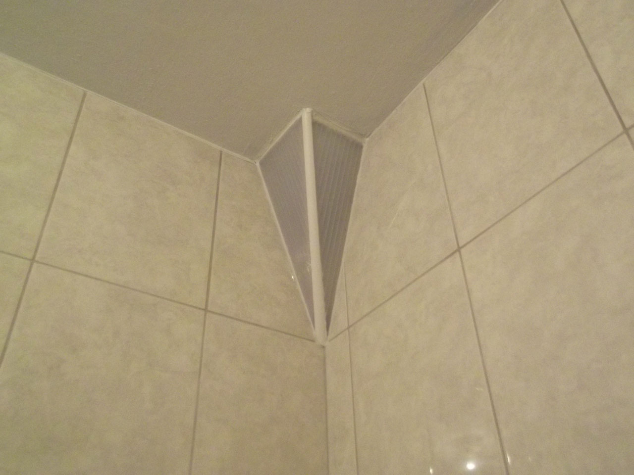 Mislim da sam ostao dužan da pokažem kako sam rešio problem. Napravio sam kutiju od ostataka leksana i lajsne za pločice. Sve to sam zalepio akrilnim silikonom za plafon i pločice.