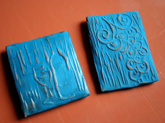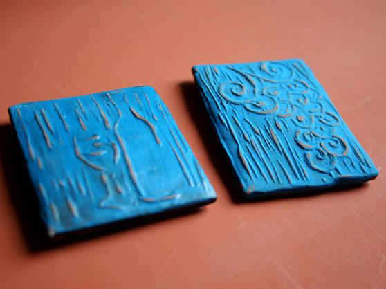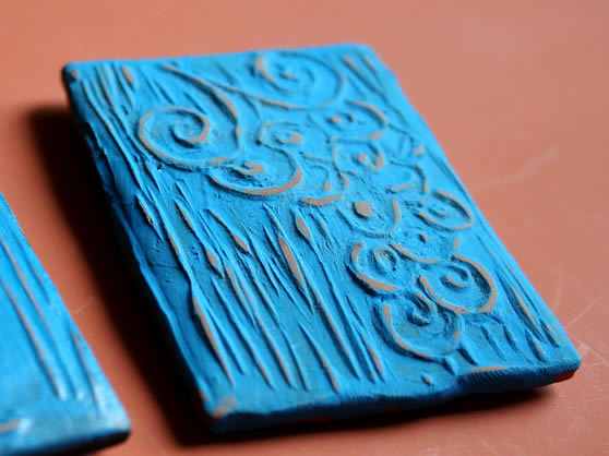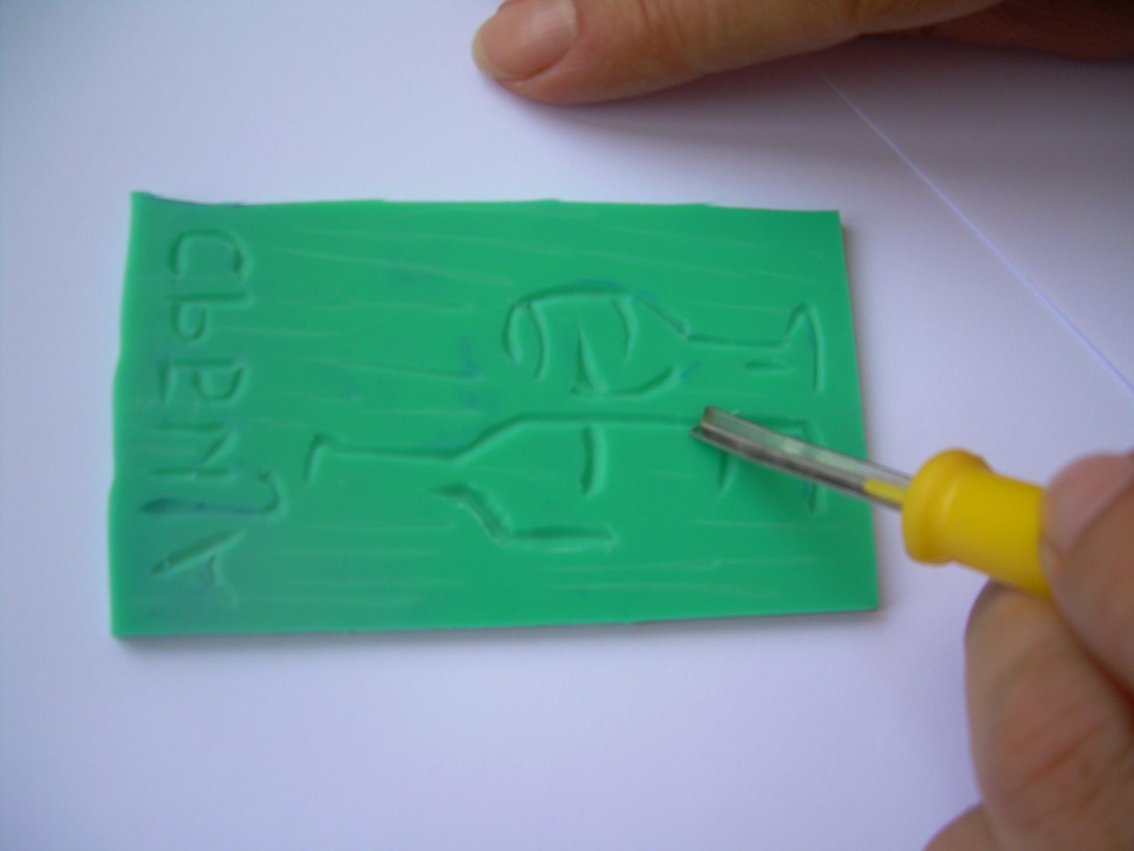 Na komadu linoleuma nacrtati motiv a zatim specijalnim nozicima izdubiti sliku. Na taj nacin se dobije pecat, koji se kasnije utiskuje u (ovom slucaju) polimersku glinu. Glina se ispece, po uputstvu proizvodjaca, a zatim se oboji. Na kraju se nalepi magnet.