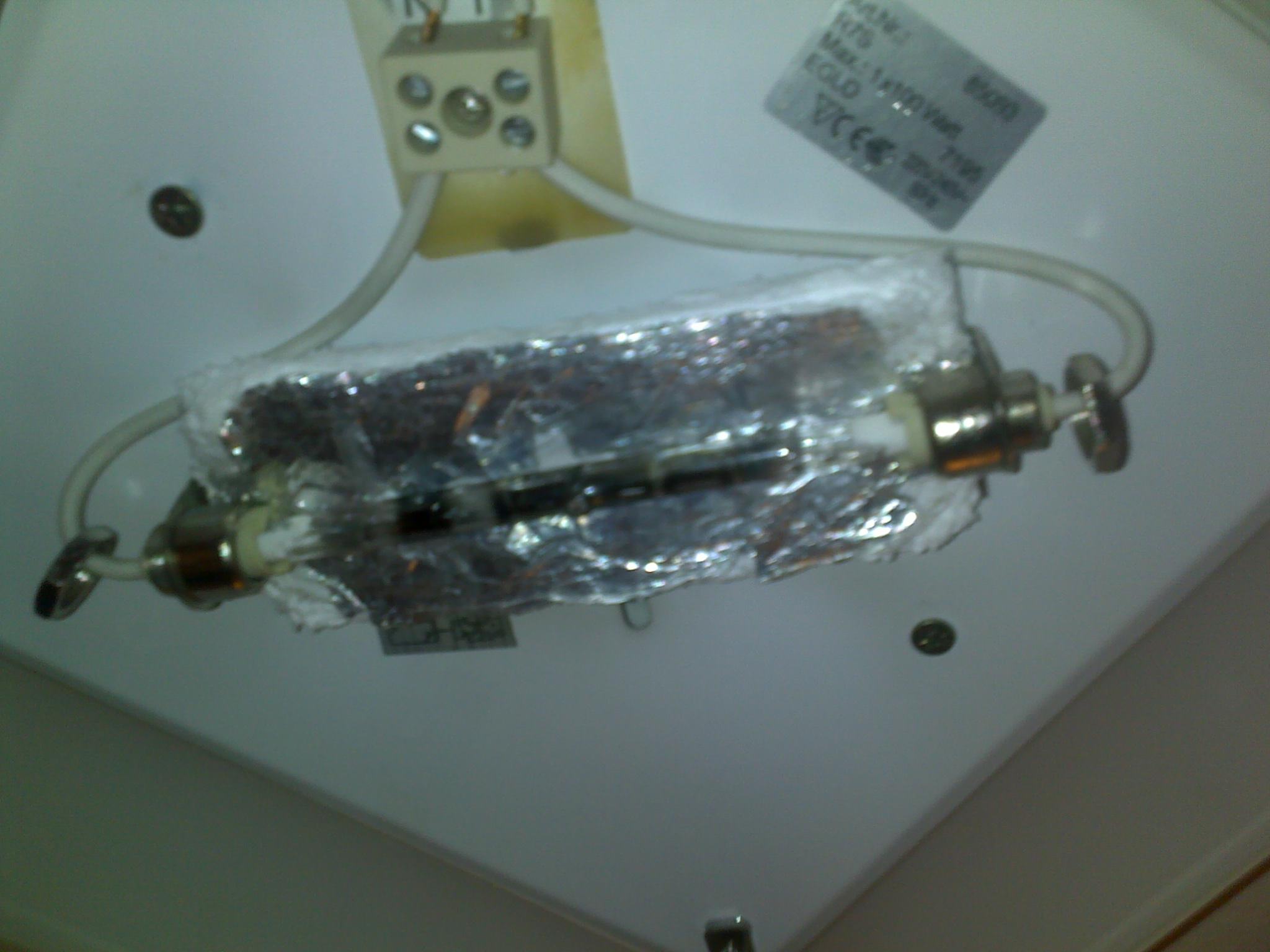To je linear-halogena sijalica od 100W sa po jednim konusnim kontaktom na svakom kraju. Sijalica dužine 118mm, ležište tipa R7S. Jedan konus je fiksni a drugi je na opruzi. Tačno kako je rekao darkelja, pomeriš u stranu i ispašće. A sijalica se spržila jer nije imala dovoljno prostora oko sebe da se hladi, naime ona se strahovito greje, a alu-folija sa izolacijom reflektuje tu toplotu nazad prema sijalici, pa još ako je u zatvorenom kućištu, to mnogo skraćuje vek sijalice. Loše rešena plafonjera, bolje izabrati neko rešenje sa ubodnim halogenim sijalicama.