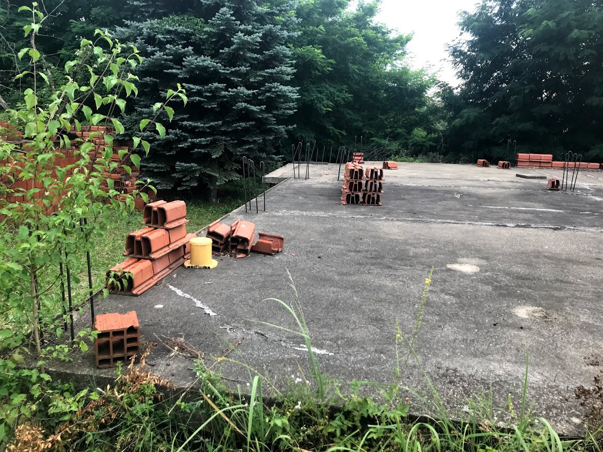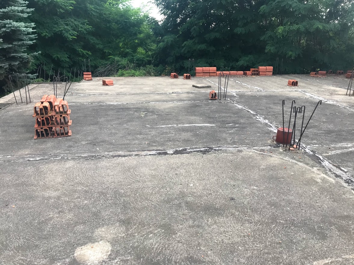 Na ploci postoji rupa gde je planirano da se uradi stepeniste - trenutno je samo rupa - videces na slikama koje sam napravila u medjuvremenu. Takodje, na ploci postoje "rupe" predvidjene za povezivanje instalacija - to je onde gde viri gvozdje na plocu (vec je uvedena struja, voda i kanalizacija u taj visoki podrum).