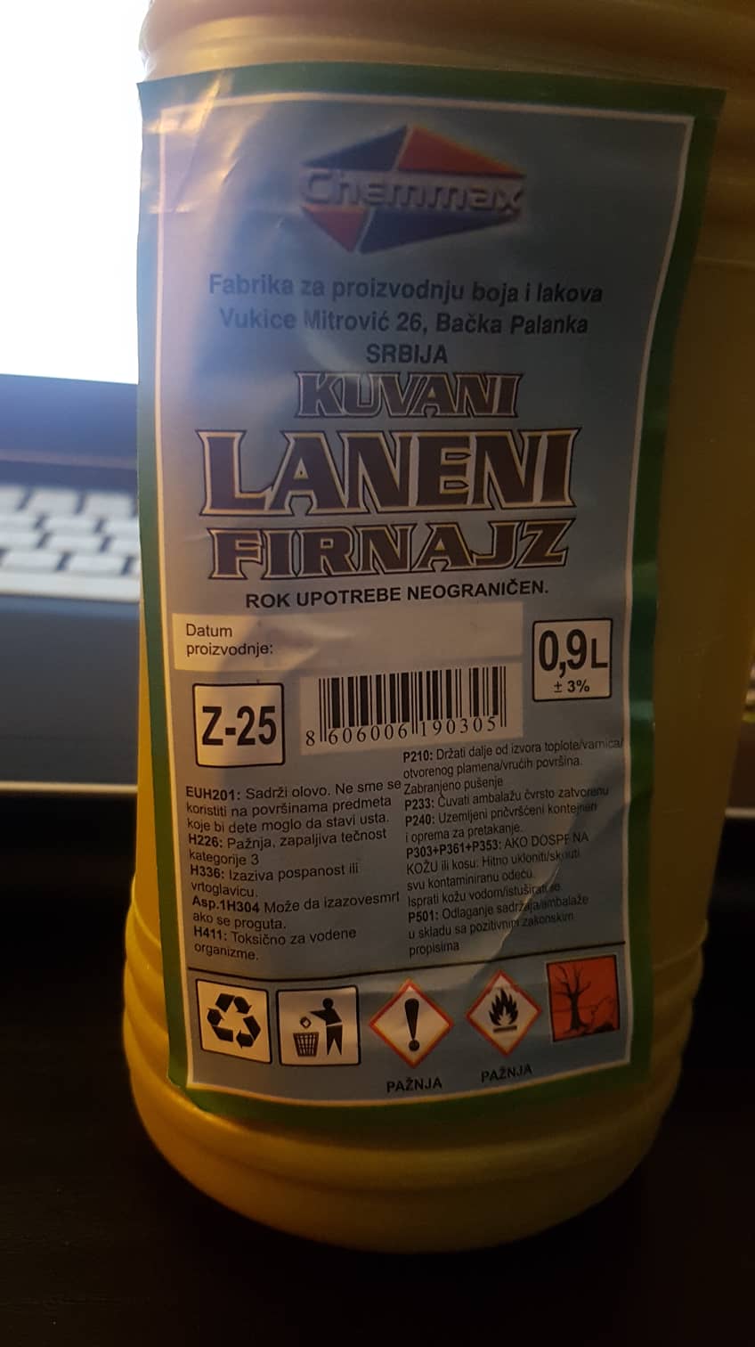 U farbari su me posavetovali da uzmem firnajz, i prodali mi neki kuvani laneni firnajz koji je bio 300-400 dinara po litri. Uzeo sam 2 litre (valjda ce biti dosta, ili je puno, ne znam). Rekli su mi da ga obavezno zagrejem i da nanesem dok je toplo vreme. Medjutim, citajuci uputstvo na ovoj flasi pise da nikako ne sme na tople povrsine i da je zapaljiv, te sam zbunjen.