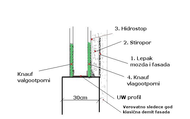 Nego šta vi mislite o ovome...Za sad,izravnjati zid stiroporom i lepkom koji se lepi na vlagootporni knauf.Pošto sam kupio hirdostop za neke radove po kući,ja bih prvo premazao knauf njime da ga još malo zaštiti od vode i vlage,tj on bi došao izmedju knaufa i stiropora.Unutra bih video kolko bi mi falilo pošto je puna debljina zida 30cm,vidi se na slici.A spolja bi sled godine uradio izolaciju cele te strane,kuće videčemo.Valjda moze izolacija na stiropor na kome su dva sloja lepka sa mrezicom...