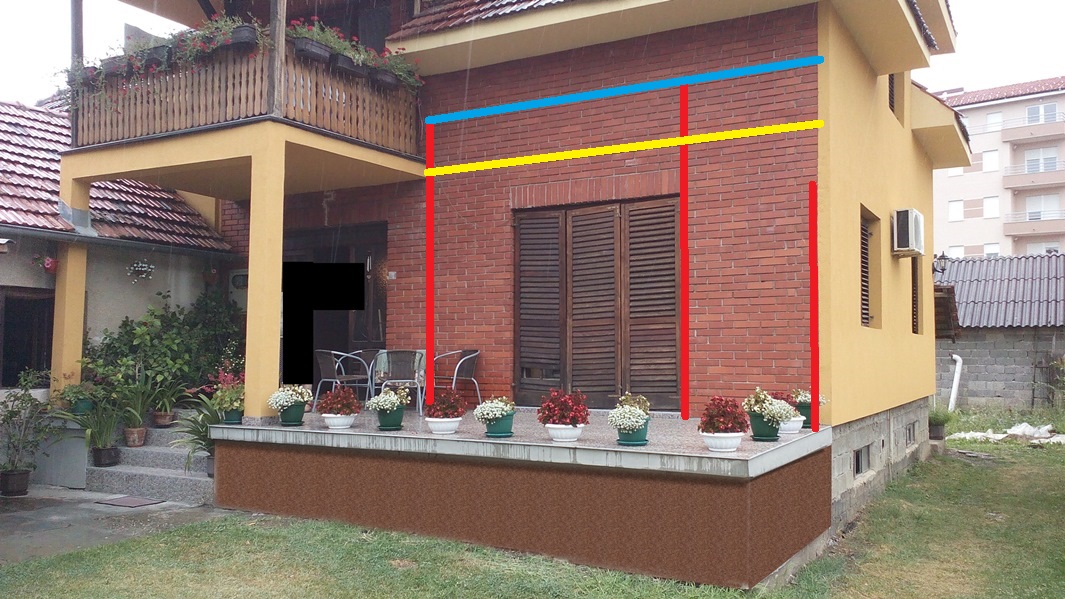 U prilogu su slike terase nad kojom se pravi trem. Označio sam gde je ploča (žuta linija), ali bih želeo da trem bude viši (plava linija), kako bi se uklopio pad trema u sveopšti izgled kuće i postojećeg krova.