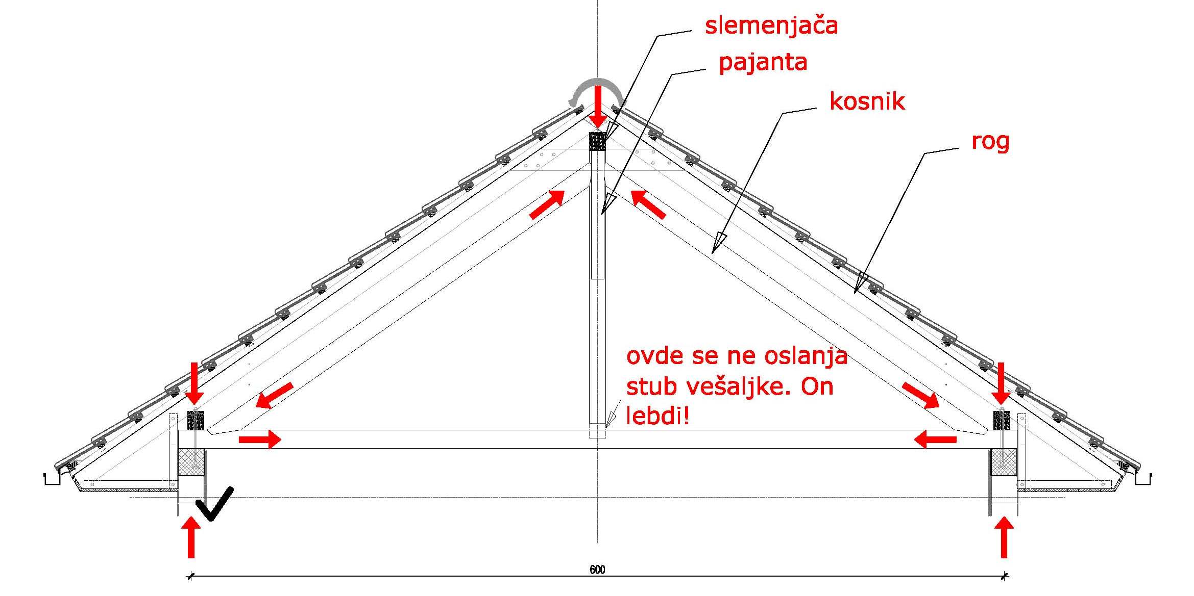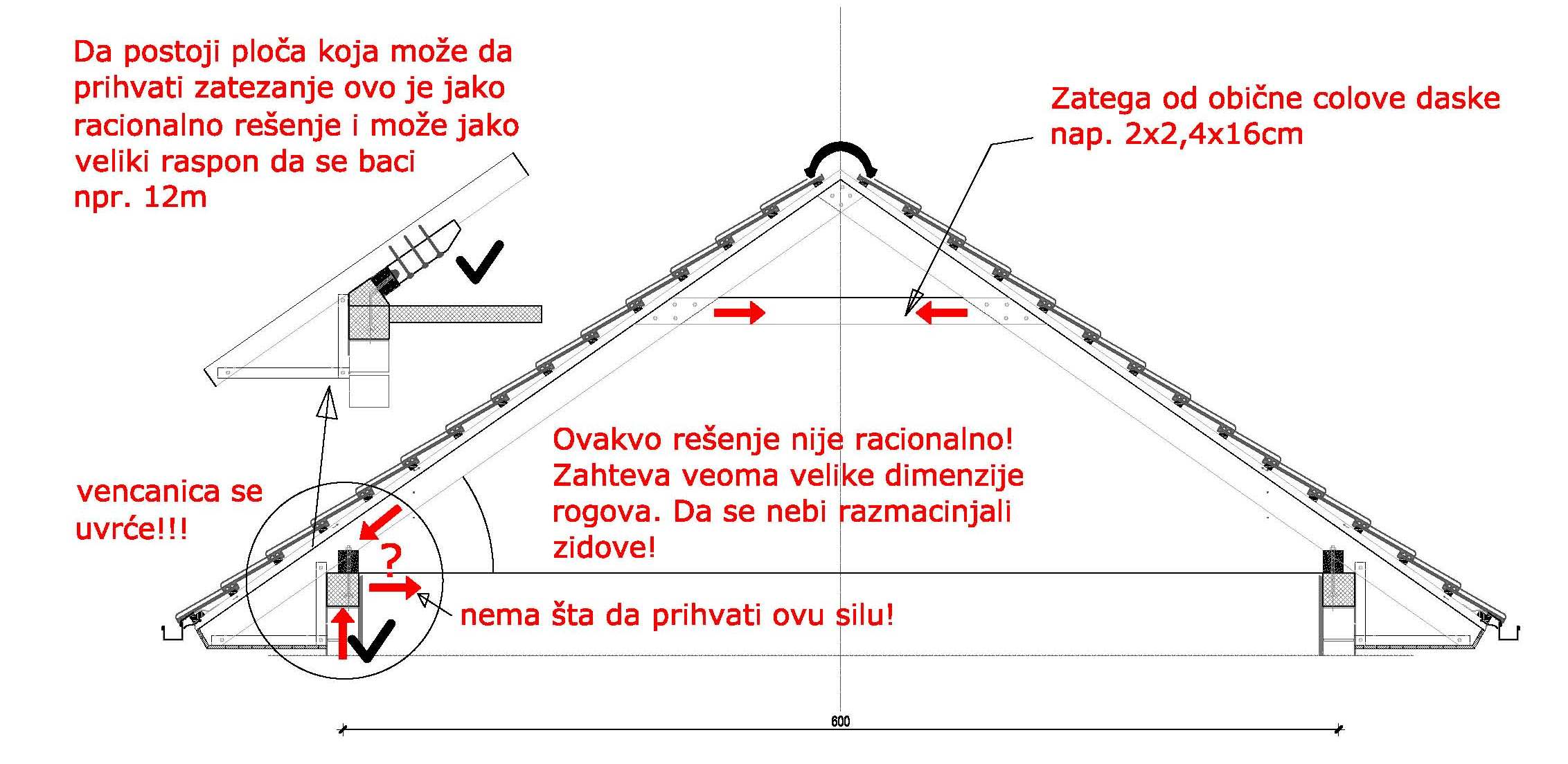 101kg, rogovi od 4m dužine su Vam kratki. Razmak rogova retko kad ide ispod 70cm. Uglavnom je veći. To što nema ploče je problem nema šta da spreči razmiacanje zidova. Dajte neku sliku kao izglede objekat. Može da se napravi krov da ne razmiče zidove ali rogovi trebaju da budu veoma veliki. Neracionalno rešenje. To se radi ali obično kad je potkrovlje za stanovanje a želi se prostor bez stubova. Tako može da se premosti i raspon 10-12m bez stolice. Druga varijanta je da ubacite tavanjače da one prihvataju zatezanje tj horizontalnu reakciju od rogova ali to znači da za svaki par rogova treba po jedna tavanjača. Poprečno bi se krov ukrutio dijagonalama koje su obično od dasaka koje se kovu sa donje strane roga u cik cak. Kada se potkrovlje koristi za stanovanje dijagonale smetaju prilikom postavljanja slojeva izolacije pa mora podaščanje krova pločama i duplo ventilisan krov. To je jedini slučaj kada podaščanje igra noseću ulogu u krovnoj konstrukciji tj. jedan vid "stressed-skin" obložne konstrukcije. To je karakteristično za montažnu gradnju i npr. metalne hale bez spregova a limeni paneli zamenjuju ulogu spregova. Nije od značaja za Vaš slučaj jer koliko sam razumeo hoćete da napravite jeftinu konstrukciju nad pomoćnim objektom. Najbolje i najjeftinije je da uradite dve vešaljke na 3 i na 6m a na kalkanskim zidovima stolice. Stavite slemenjaču na vrhu sa pajantama da podužno ukrute krov. Preko H.S. venčanicu i ređate rogove najnormalnije bez ikakvog podašćanja... Vešaljku bi ako ne znate šta je ipak trebao da napravi malo bolji tesar. Dimenzije pojedinih elemenata bi trebalo da se sračunaju.