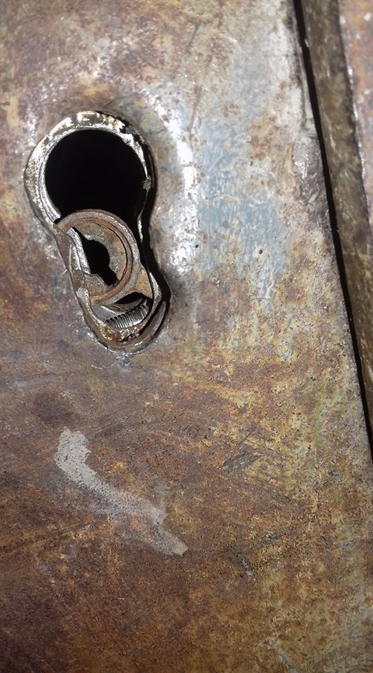 Ipak, ako uspete da dovedete ovaj srednji deo u položaj kao na slici, probajte širim šrafcigerom da ga zakrenete ulevo, možda ovaj patrljak od jezička bude dovoljan da se brava otključa.