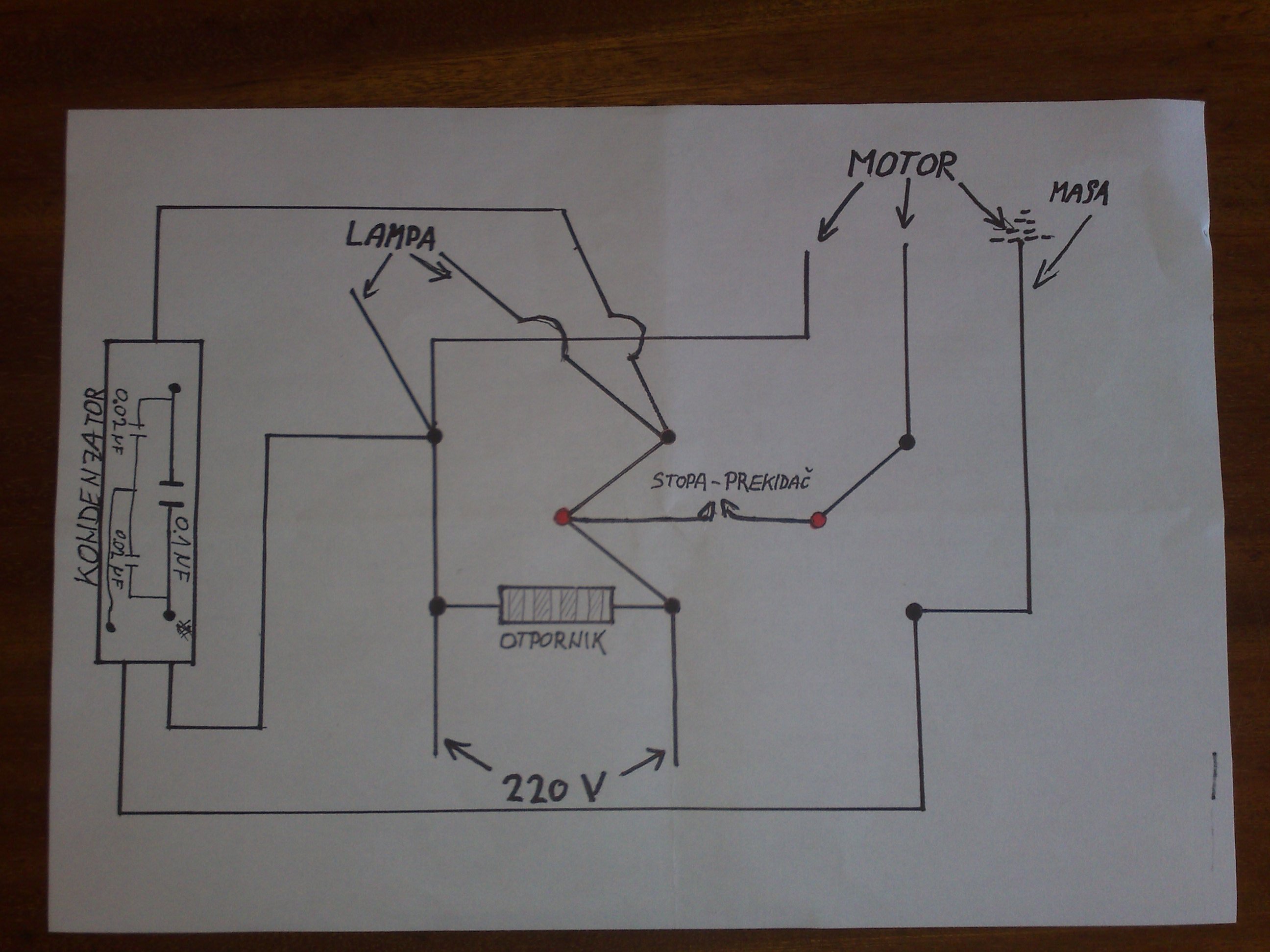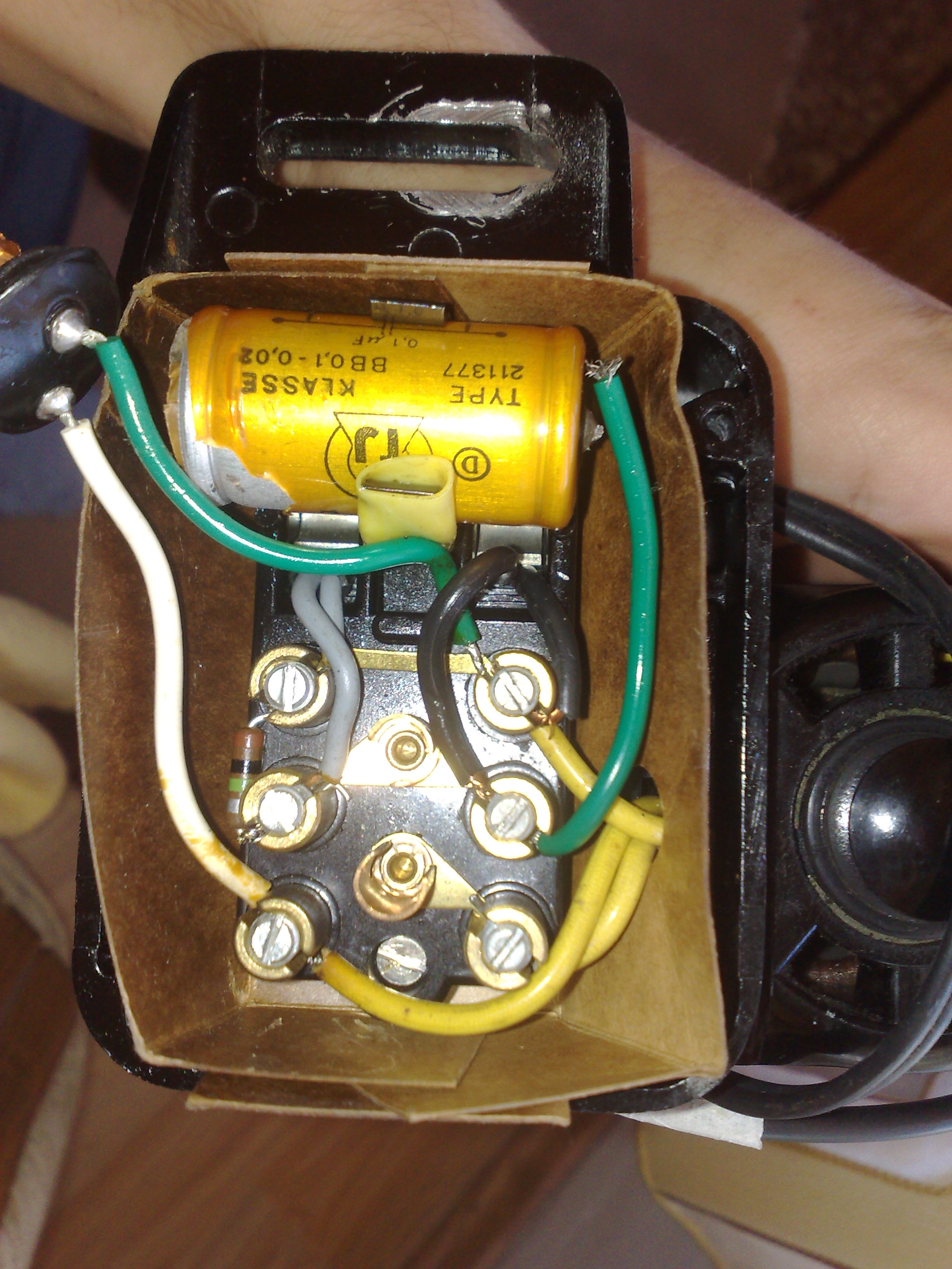 imam singer masinu za sivanje stara je oko 30 god,neznam ni ja tacno,stajala je duze vrijeme,ukljucio je i malo radila i nesto puknu i zasmrdi,otvorim onu kutiju kod motora i izbio kondenzator,smrdi uzasno,sad nemogu naci isti takav kond,cudan mi je jer ima 3 zice na sebi,2 sa jedne strane i 1 sa druge,bijela i zelena su na jednoj strani a crna na drugoj,jel moze da se ukopca obicni kond sa 2 zice iste ili priblizne vrijednosti umjesto toga,evo skica sheme sa starog kondenzatora