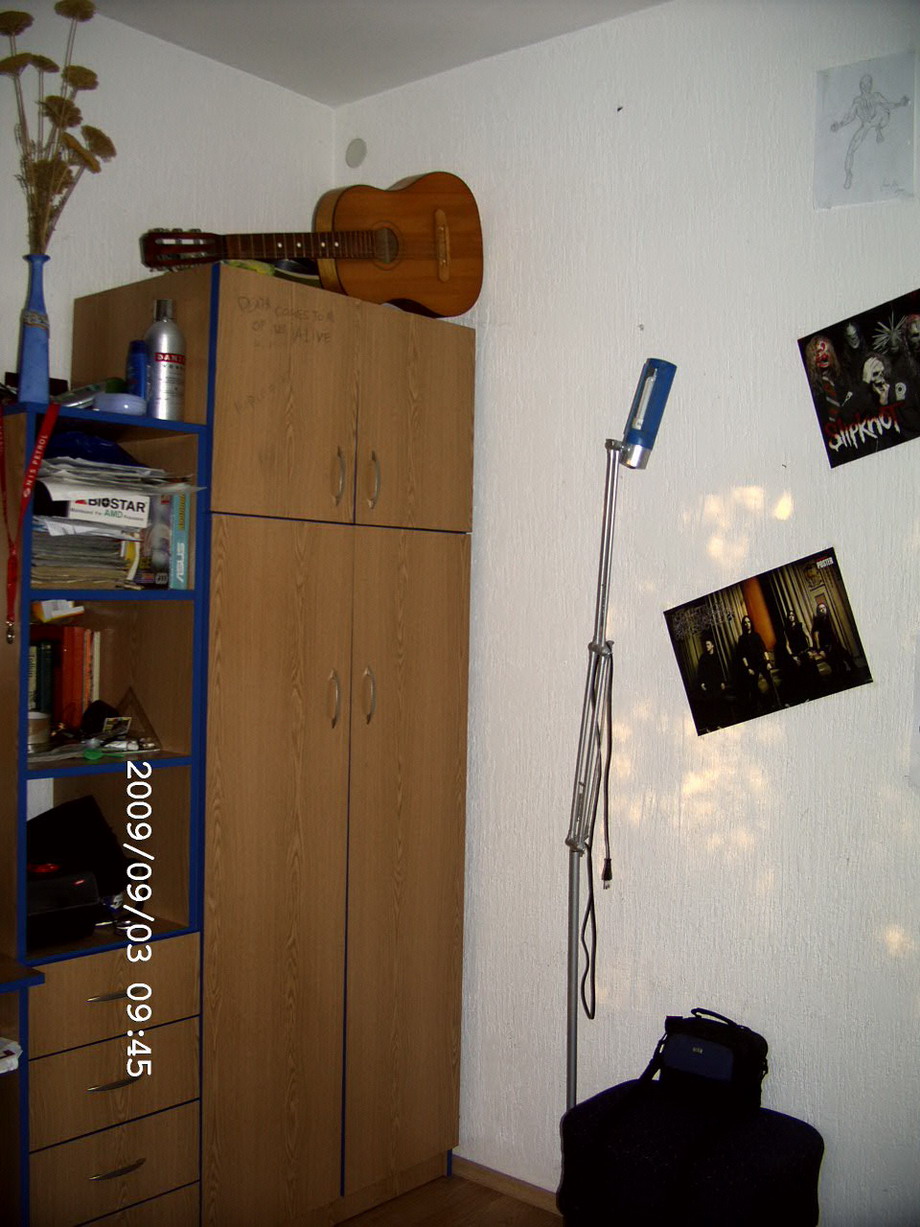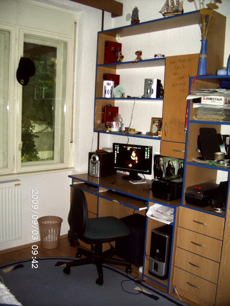 Soba mu je mala 2.5 sa 3.0m, uglavnom u plavoj boji sa nameštajem na meru rađenim u boji drveta(svetlo), zidovi su obojeni u belo da bi delovala veće ali nisu ravni već čuveni ‚‚španski zid‚‚.