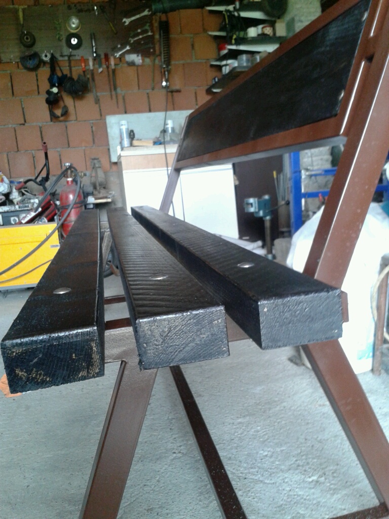 Nogarite i poprecnite nosa;i na trupcite se pravat isto od dab (hrast) ili bagrem (akacija) . Dokolku sakate da vi bide mobilna masata ( shto e problematicno radi tezinata) nogarkite se izramnuvaat od dolnata strana , no mozat i kako kolec da se pobijat vo zemjata (ako sakate masata da bide staticna).